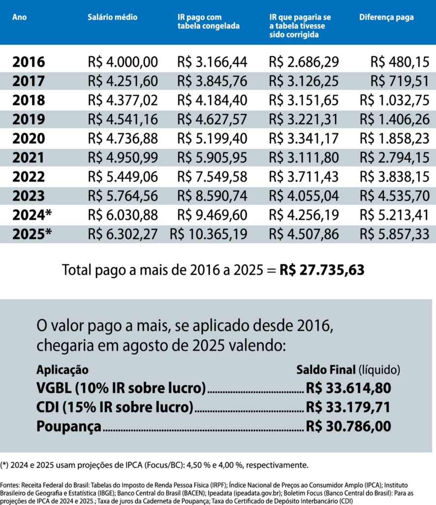 Nossas simulações ilustram o tamanho da perda: um trabalhador que ganhava R$ 4.000 em janeiro de 2016 e teve o salário apenas corrigido pelo IPCA até 2025 deixou de poupar cerca de R$ 27,7 mil pela ausência de correção da tabela. Se esse valor tivesse sido investido de forma conservadora, poderia hoje superar R$ 33 mil em aplicações atreladas ao CDI.